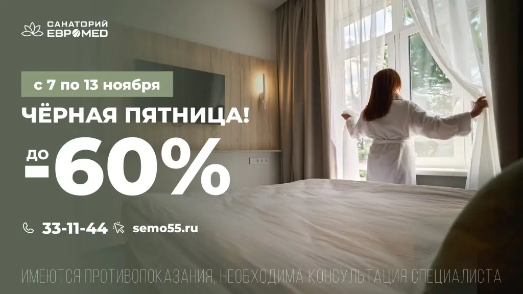 Скидка 60% действует на лечебные программы при бронировании от 7 суток.