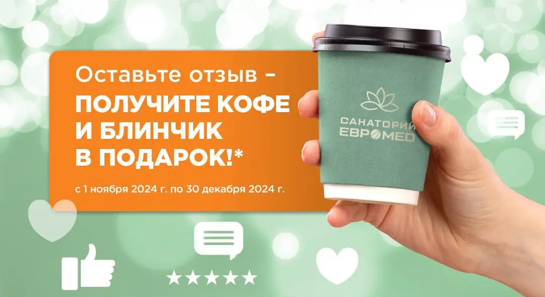 С 30 октября по 30 декабря 2024 года в Санатории «Евромед» действует акция «Кофе и блинчик в подарок за отзыв!»*.