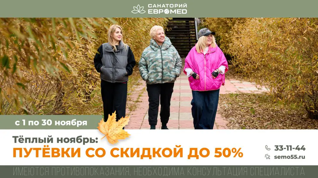 Скидка 50% на лечебные и оздоровительные путевки при заезде с 1 ноября и с выездом не позднее 30 ноября.