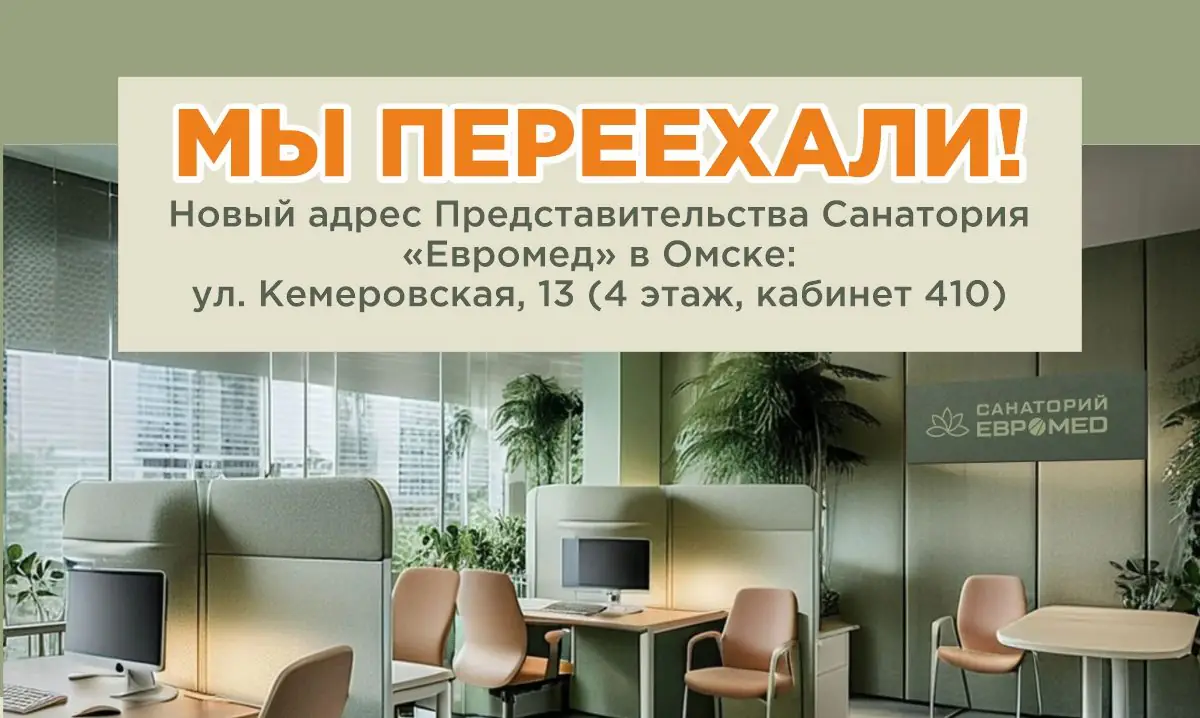 С 18 октября Представительство Санатория «Евромед» работает по новому адресу: ул. Кемеровская, 13 (4 этаж, кабинет 410) – в самом просторном и современном корпусе Медицинского центра «Евромед». Ждем вас в гости, будем счастливы помочь с оформлением путевок!